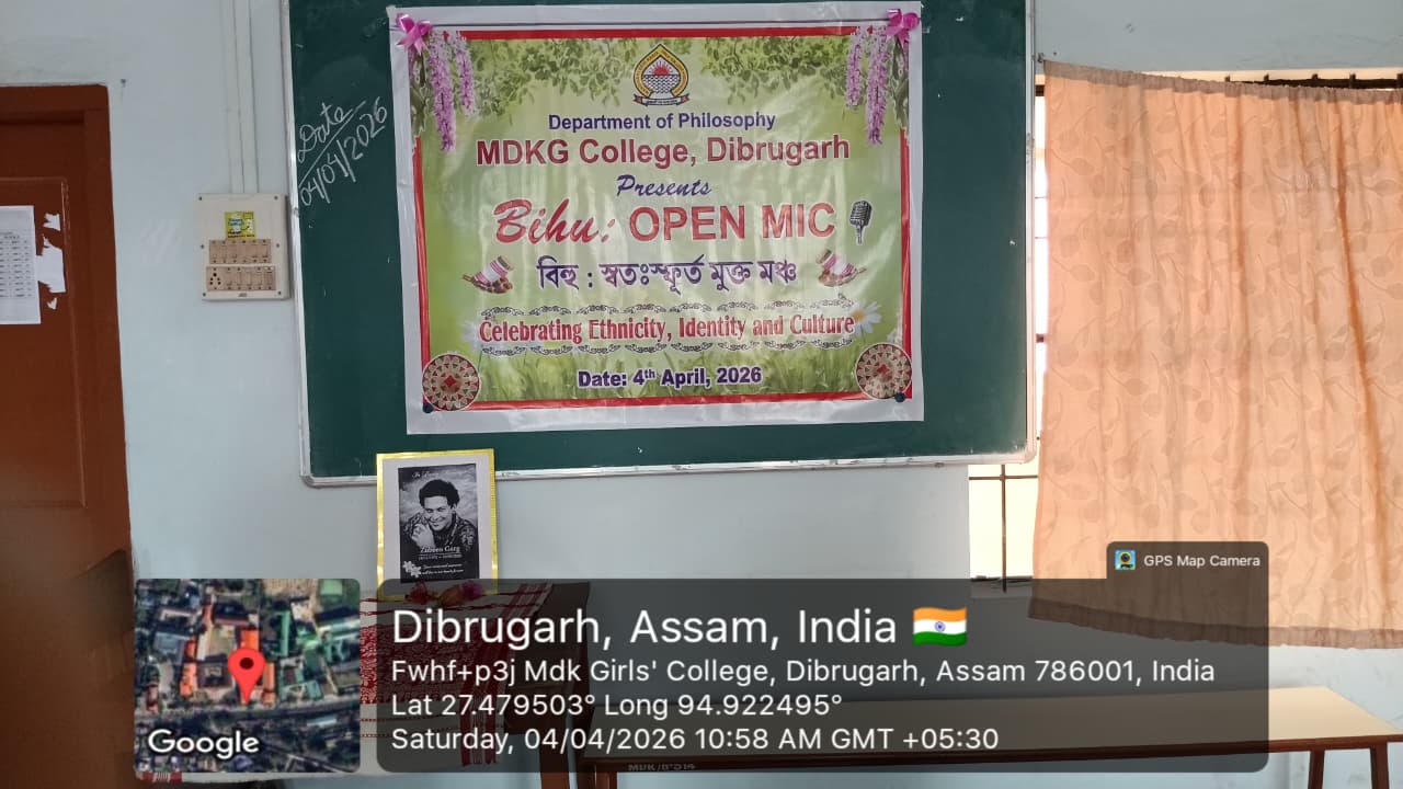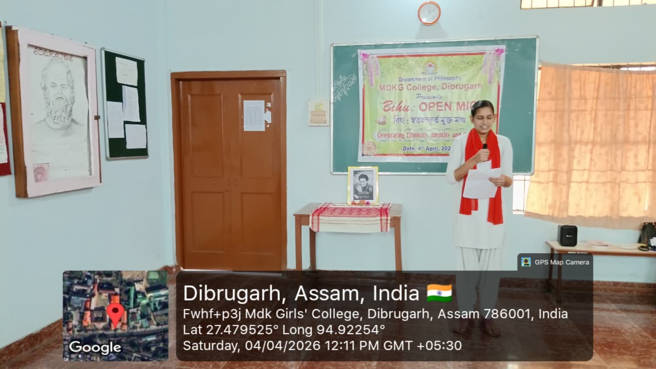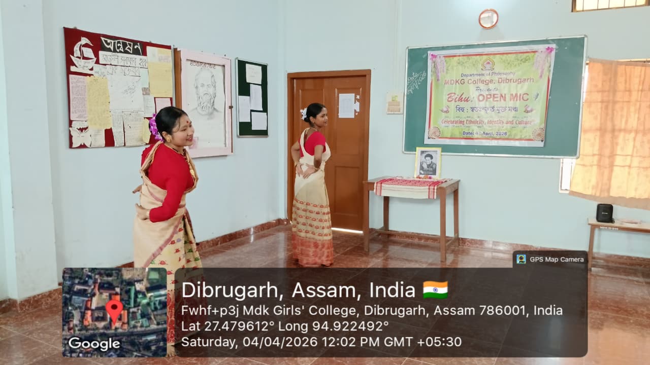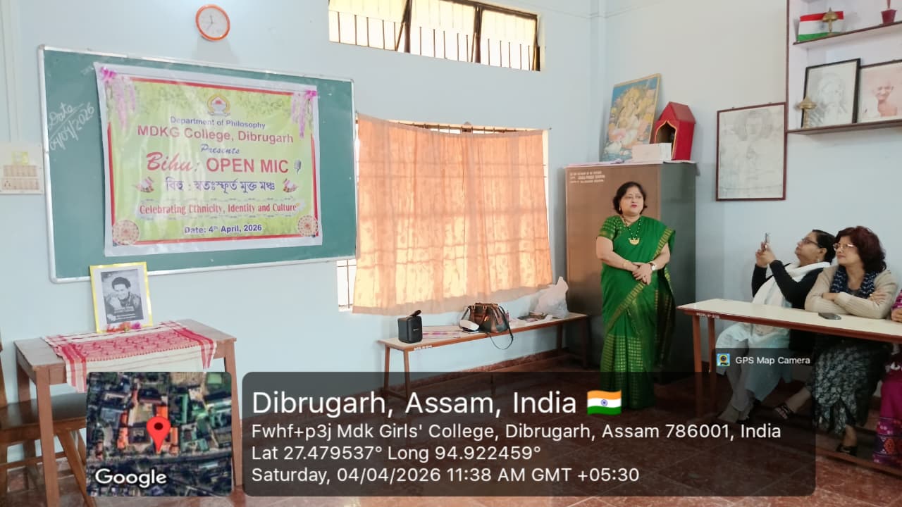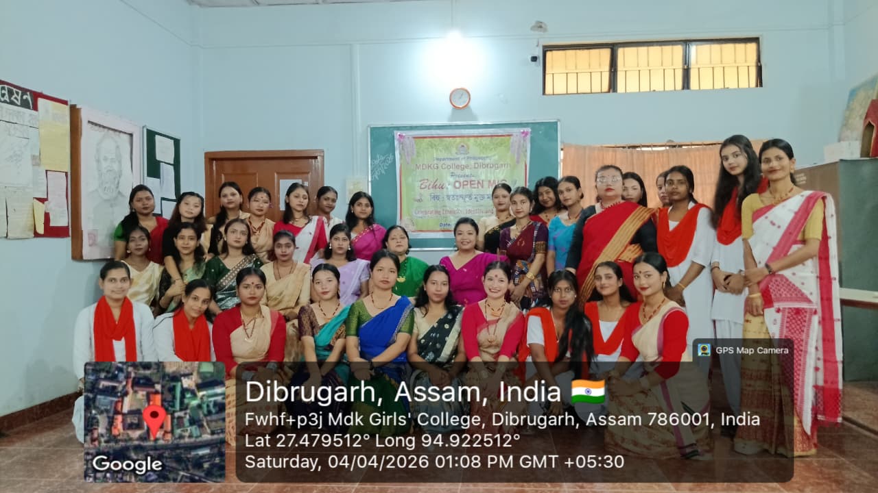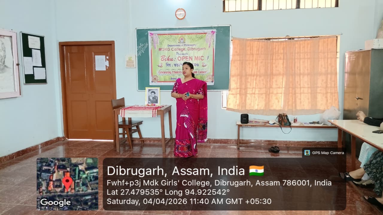 The Department of Philosophy, MDKG College, successfully organized the vibrant event “Bihu Open Mic: Celebrating Ethnicity, Identity and Culture” on 4th April 2026, with the aim of promoting and preserving the rich cultural heritage of Assam while fostering respect for ethnic identity and collective ethos as envisioned by UGC. A key objective of the programme was to inspire students to understand how creative expressions of culture can contribute to the growth of the Orange Economy in the journey towards Viksit Bharat 2047. The program started by few words by Dr.Rupali Majumder,HoD of the department of philosophy and the event was inaugurated by Dr. Mitali Sonowal, a distinguished Bor Bihuati and accomplished performer of Dhol, Bahi, and Pepa. The programme began with a heartfelt tribute to multi genius cultural icon and heart throb of people of Assam, Zubeen Garg, followed by a captivating solo Bihu dance by our student, Gitanjali Dutta. Students enthusiastically showcased their talents through group and solo Bihu dances, Bihu songs, traditional food presentations, and self-composed poems in Assamese and Hindi language. A special highlight was a beautiful self-composed poem ‘Basanta’ recited by Puspa Gaonkhowa, faculty member of the department of Sanskrit, reflecting the spirit of spring and the arrival of Bihu. Rukhsar Khatoon (student) also moved the audience with her self -composed Hindi poem ‘Bihu’. The presence and inspiring words of esteemed faculty members, along with Dr. Ashwini Machey, Coordinator of IQAC, who spoke on the significance of the Orange Economy, enriched the programme. Traditional delicacies like Til Pitha and Gheela Pitha added cultural flavour to the celebration. The ‘Bihu Open Mic’, event was a resounding success, marked by enthusiastic spot participation from students, reflecting spontaneity, creativity and vibrant cultural expression. The event concluded with a heartfelt vote of thanks delivered by the HoD of Philosophy, Dr. Rupali Majumder, marking a memorable celebration of culture, creativity, and community spirit.