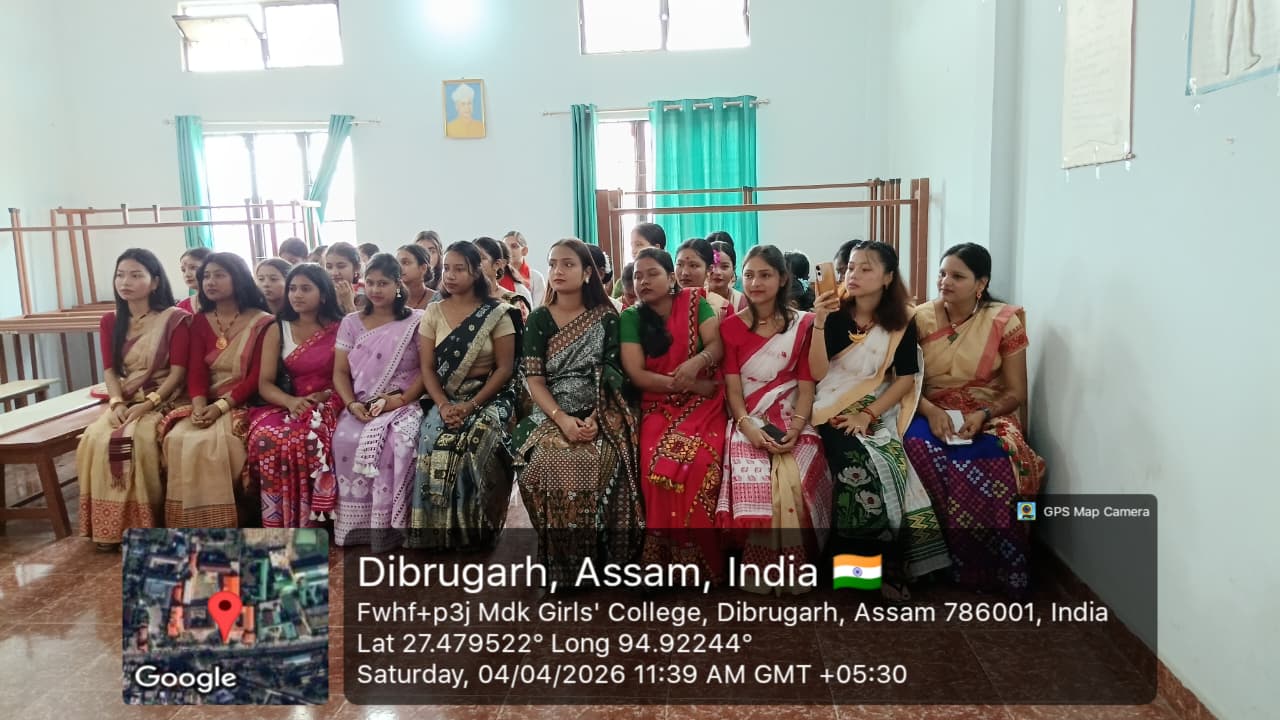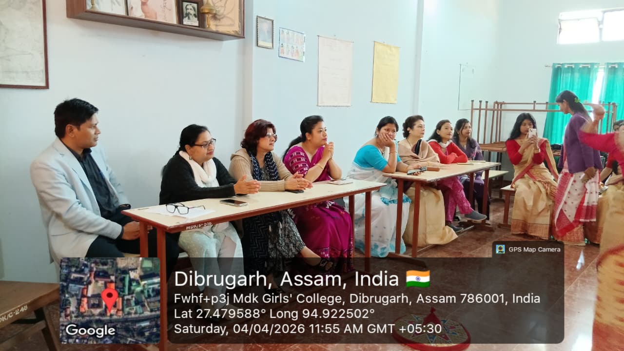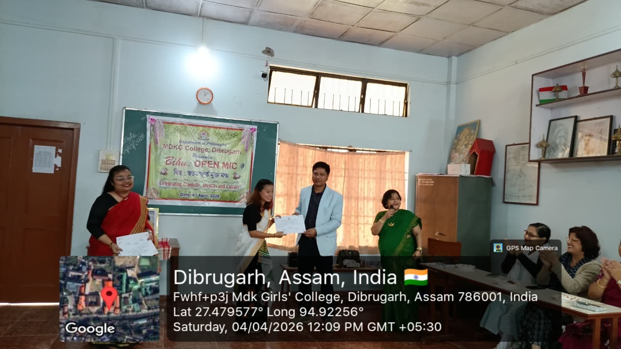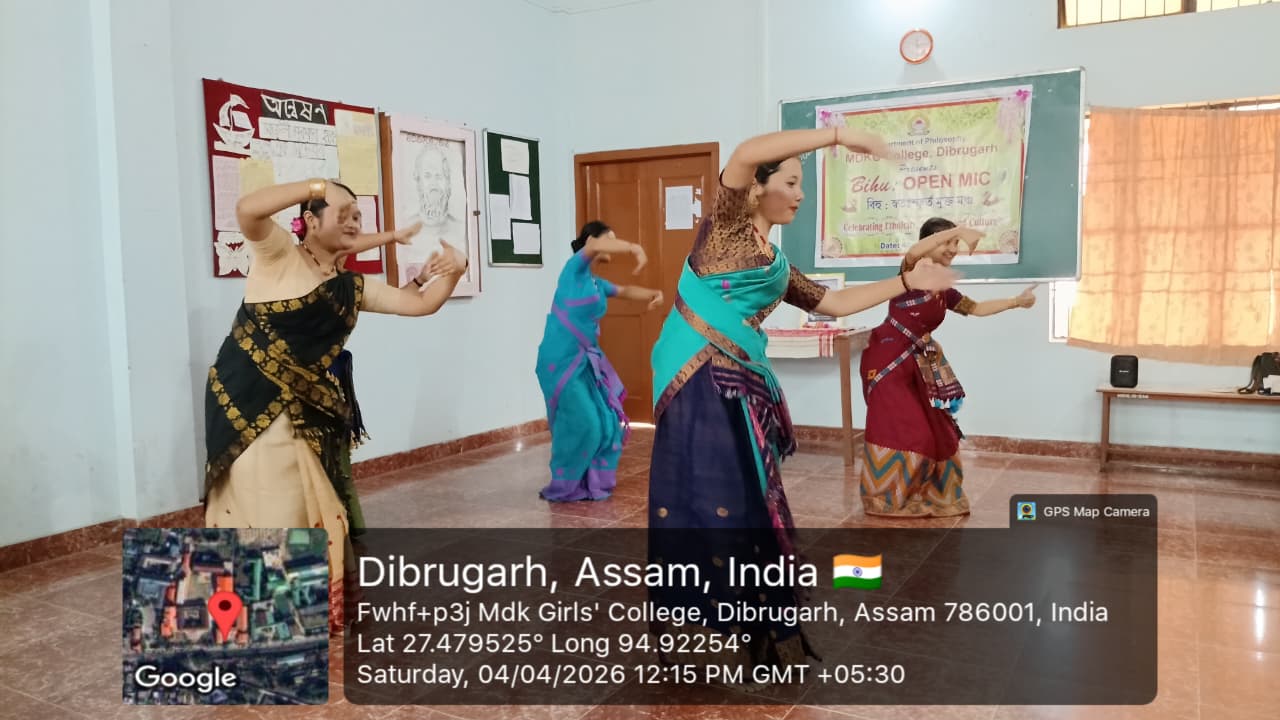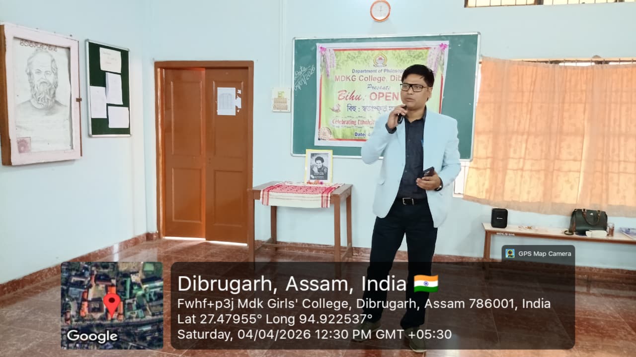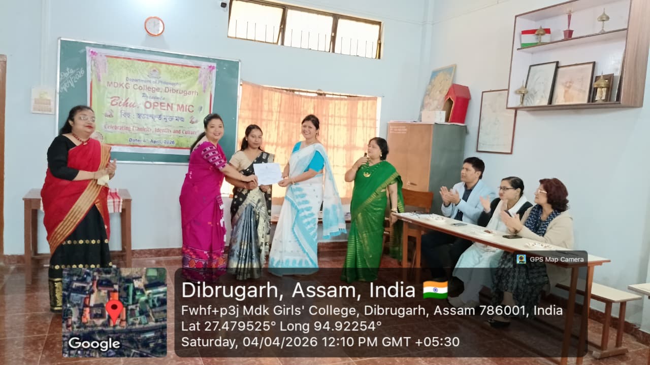 The Department of Philosophy, MDKG College, successfully organized the vibrant event “Bihu Open Mic: Celebrating Ethnicity, Identity and Culture” on 4th April 2026, with the aim of promoting and preserving the rich cultural heritage of Assam while fostering respect for ethnic identity and collective ethos as envisioned by UGC. A key objective of the programme was to inspire students to understand how creative expressions of culture can contribute to the growth of the Orange Economy in the journey towards Viksit Bharat 2047. The program started by few words by Dr.Rupali Majumder,HoD of the department of philosophy and the event was inaugurated by Dr. Mitali Sonowal, a distinguished Bor Bihuati and accomplished performer of Dhol, Bahi, and Pepa. The programme began with a heartfelt tribute to multi genius cultural icon and heart throb of people of Assam, Zubeen Garg, followed by a captivating solo Bihu dance by our student, Gitanjali Dutta. Students enthusiastically showcased their talents through group and solo Bihu dances, Bihu songs, traditional food presentations, and self-composed poems in Assamese and Hindi language. A special highlight was a beautiful self-composed poem ‘Basanta’ recited by Puspa Gaonkhowa, faculty member of the department of Sanskrit, reflecting the spirit of spring and the arrival of Bihu. Rukhsar Khatoon (student) also moved the audience with her self -composed Hindi poem ‘Bihu’. The presence and inspiring words of esteemed faculty members, along with Dr. Ashwini Machey, Coordinator of IQAC, who spoke on the significance of the Orange Economy, enriched the programme. Traditional delicacies like Til Pitha and Gheela Pitha added cultural flavour to the celebration. The ‘Bihu Open Mic’, event was a resounding success, marked by enthusiastic spot participation from students, reflecting spontaneity, creativity and vibrant cultural expression. The event concluded with a heartfelt vote of thanks delivered by the HoD of Philosophy, Dr. Rupali Majumder, marking a memorable celebration of culture, creativity, and community spirit.