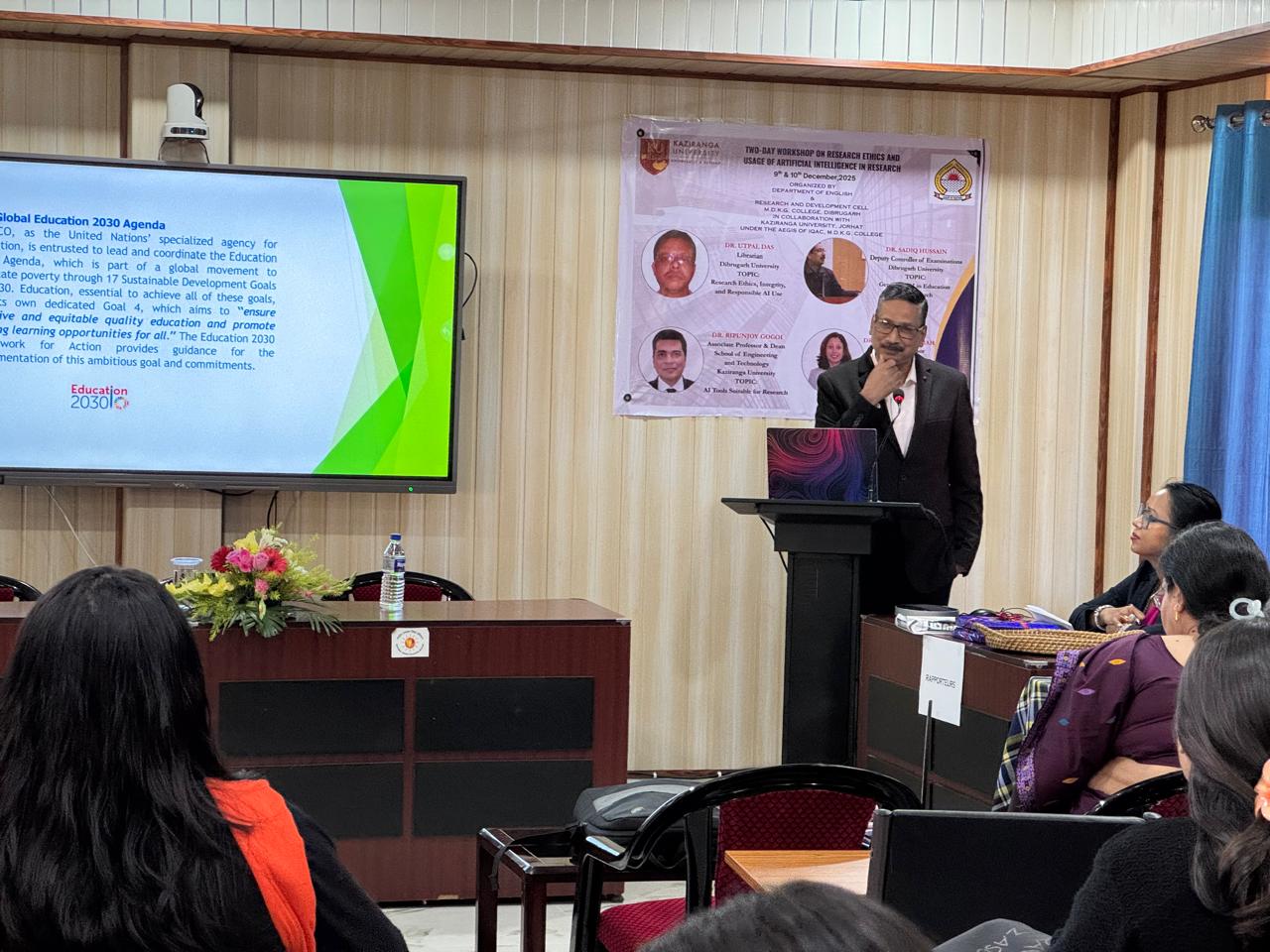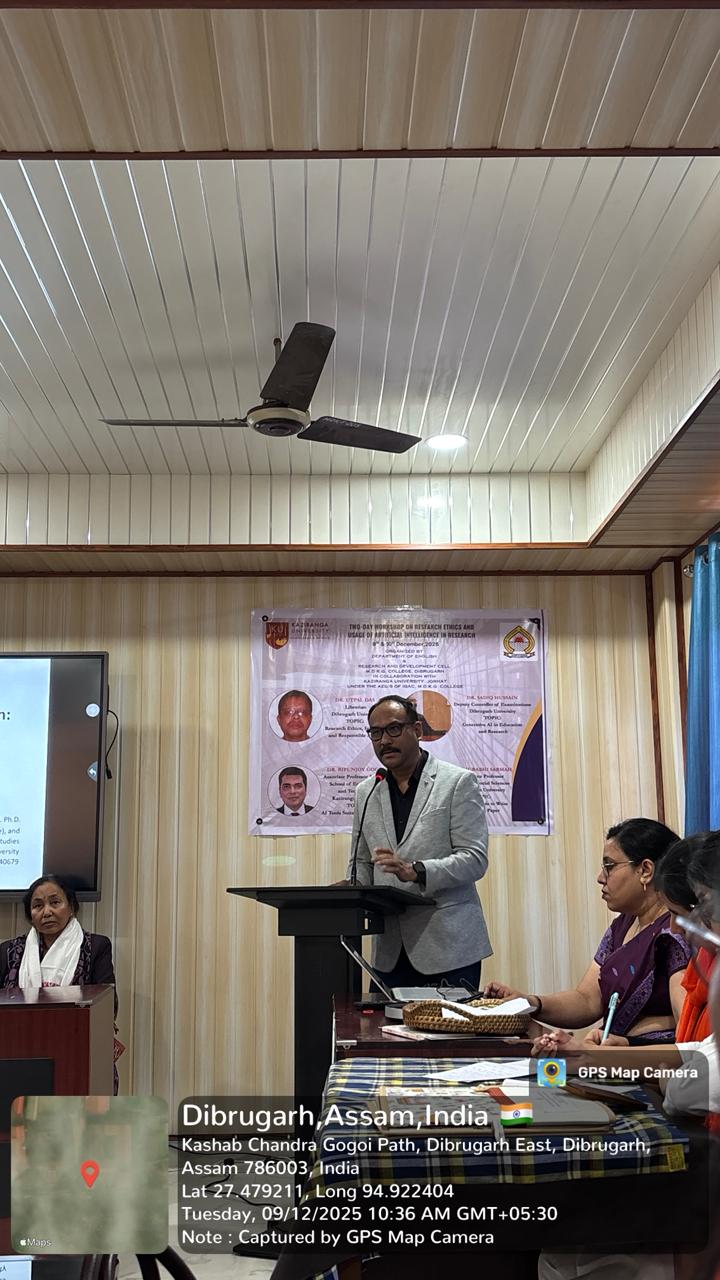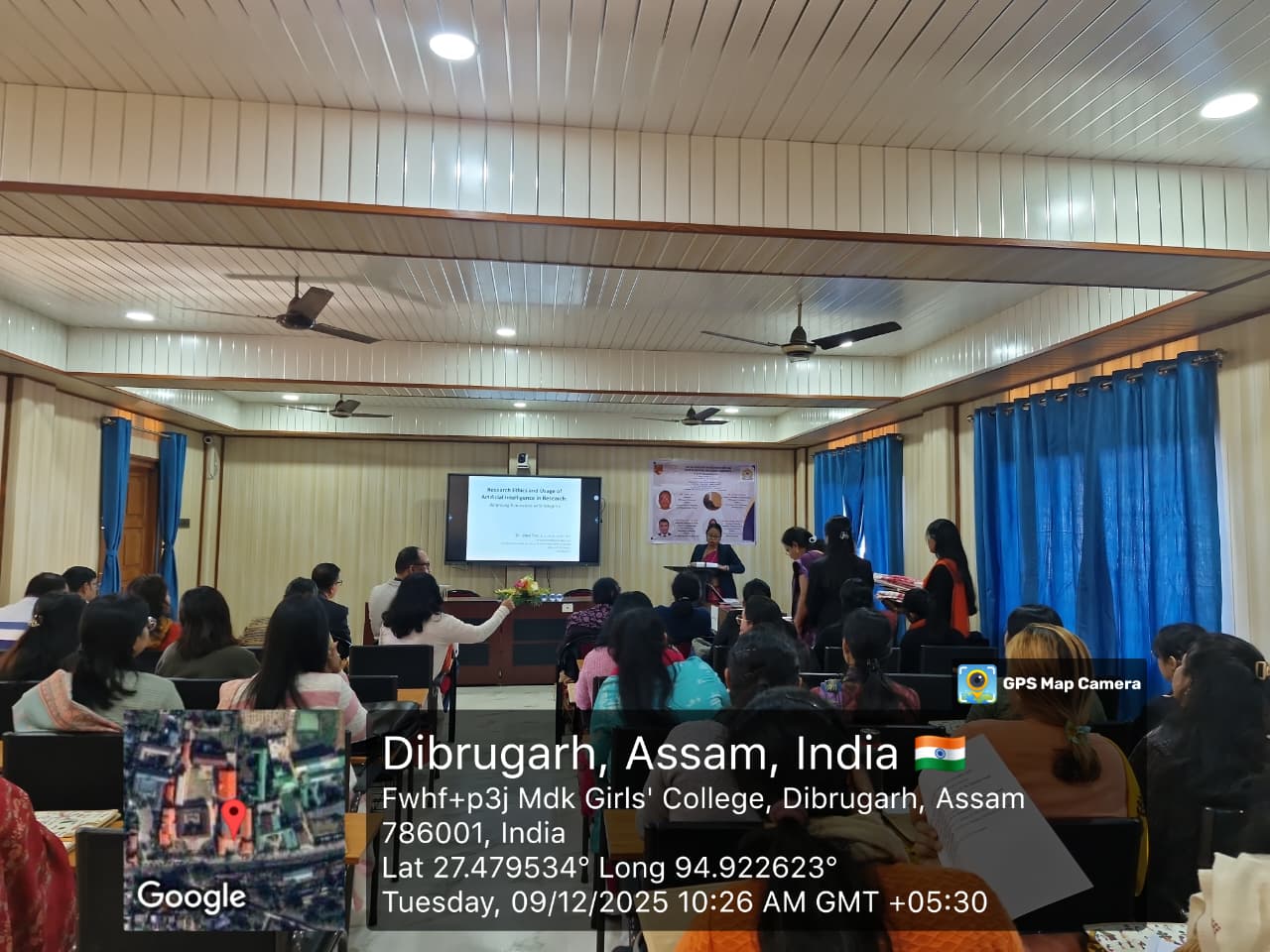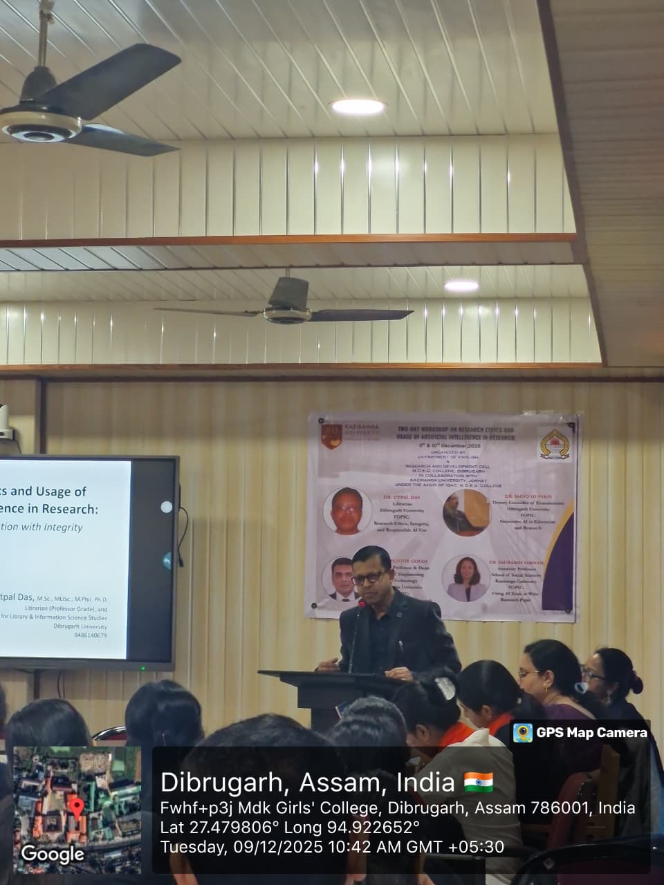 A two-day workshop on “Research Ethics and Usage of Artificial Intelligence in Research” was successfully organized by the Department of English and the Research and Development Cell (RDC), M.D.K.G. College, Dibrugarh, in collaboration with Kaziranga University, Jorhat, under the aegis of IQAC, M.D.K.G. College, on 9th and 10th December 2025. The workshop aimed at sensitizing teachers, research scholars, and students to the ethical dimensions of research and the responsible use of Artificial Intelligence in academic and research practices.